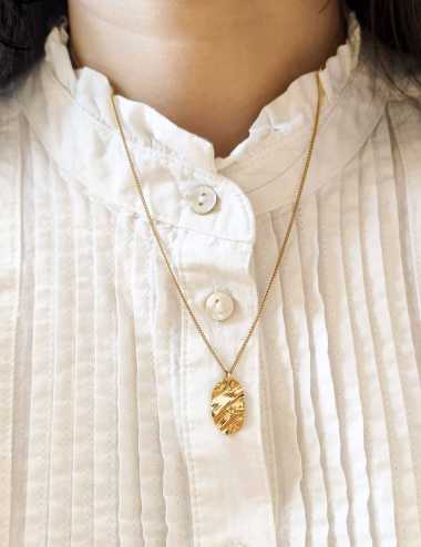 La pièce est ensuite confiée à un doreur de renom, garantissant une dorure à l’or fin de haute qualité, à la fois lumineuse et durable. Monté sur une chaîne réglable sur 6 cm, ce collier s’adapte parfaitement à différentes longueurs de décolleté.